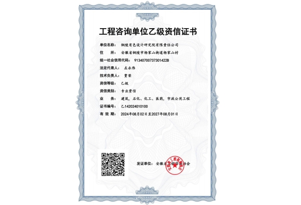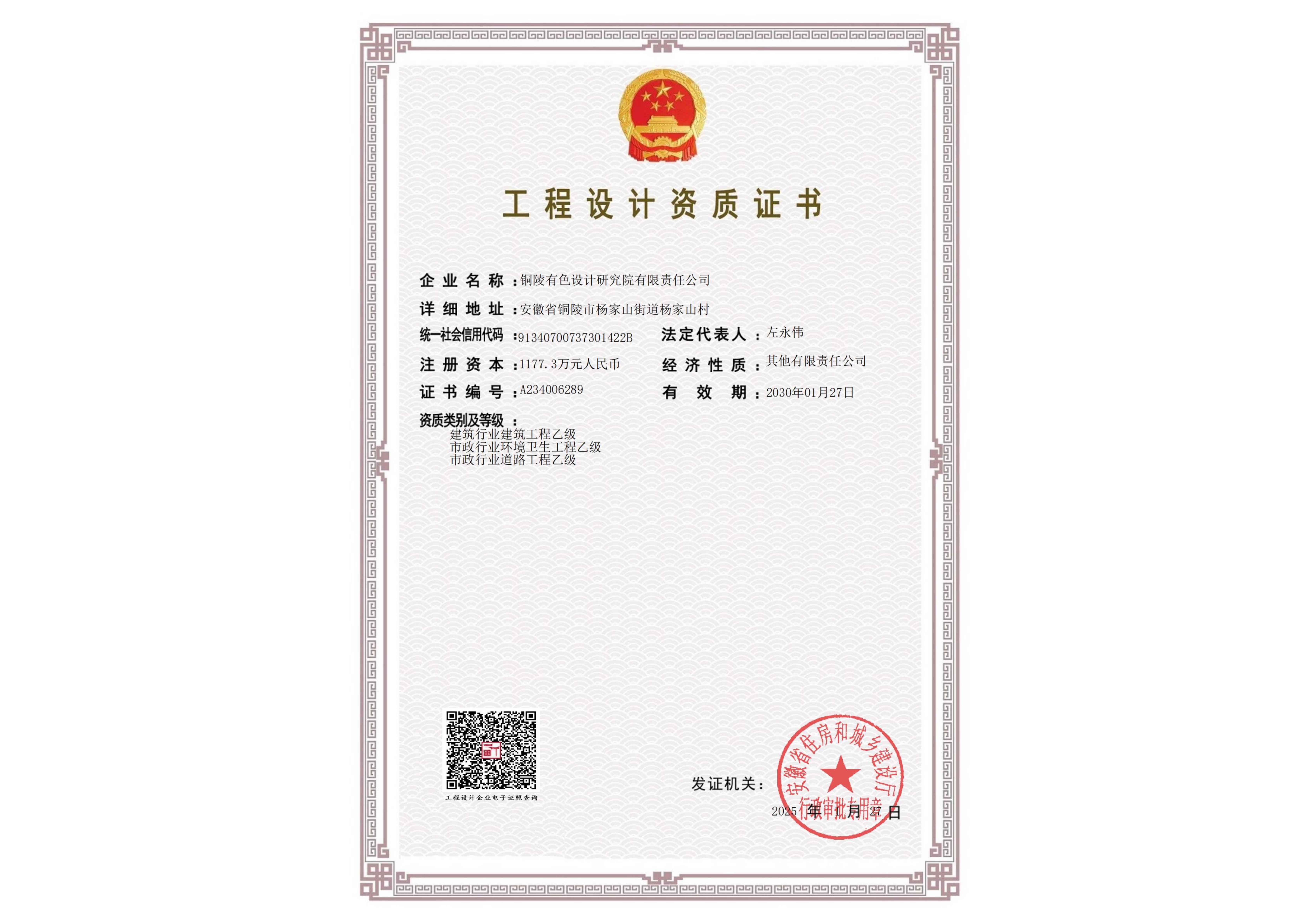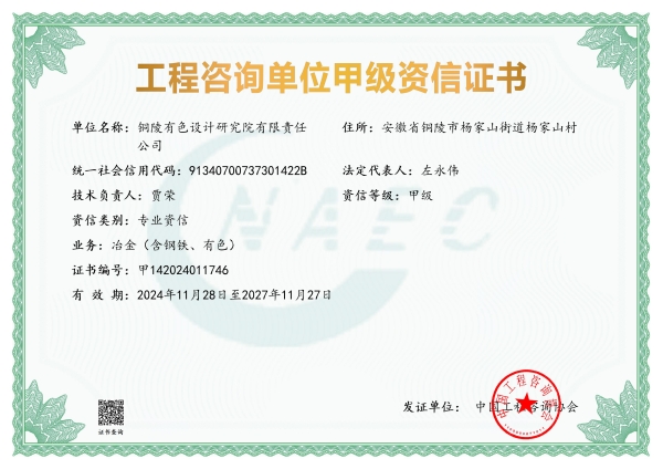 工程設(shè)計(jì)(冶金行業(yè)甲級(jí))資質(zhì)證書